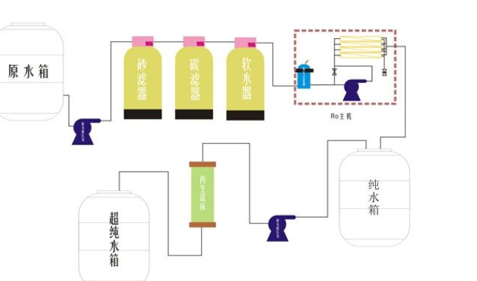 2: 預(yù)處理-一級反滲透-二級反滲透(正電荷反滲膜)-純化水箱-純水泵-紫外燈-用水點